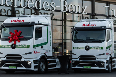 Przekazanie dwóch pierwszych eActrosów 600 dla firmy Raben Transport odbyło się uroczyście 8 grudnia w Emilianowie – warszawskim oddziale Daimler Truck Retail Polska.