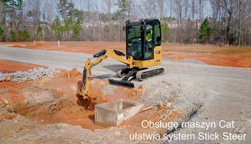 Monitor LCD nowej generacji wyświetla informacje o maszynie. Poruszanie się po placu budowy ma ułatwiać opcja Cat Stick Steer. Umożliwia łatwe przełączanie z tradycyjnych elementów sterowania jazdą (dźwigni i pedałów) na sterowanie dżojstikiem za pomocą jednego przycisku (mniejszy wysiłek i precyzyjniejsze sterowanie). Odchylane podwozie ma pozwalać na pracę na małych przestrzeniach. Producent zwraca uwagę na łatwość obsługi i konserwacji koparki. Rutynowe punkty kontrolne są łatwo dostępne z poziomu podłoża, przez boczne drzwi. Odchylana kabina pozwala w razie konieczności dosięgnąć dodatkowych obszarów serwisowych. Niewielki, 1,1-litrowy silnik dysponuje mocą 21 KM. Masa eksploatacyjna nieznacznie przekracza 2 t.
